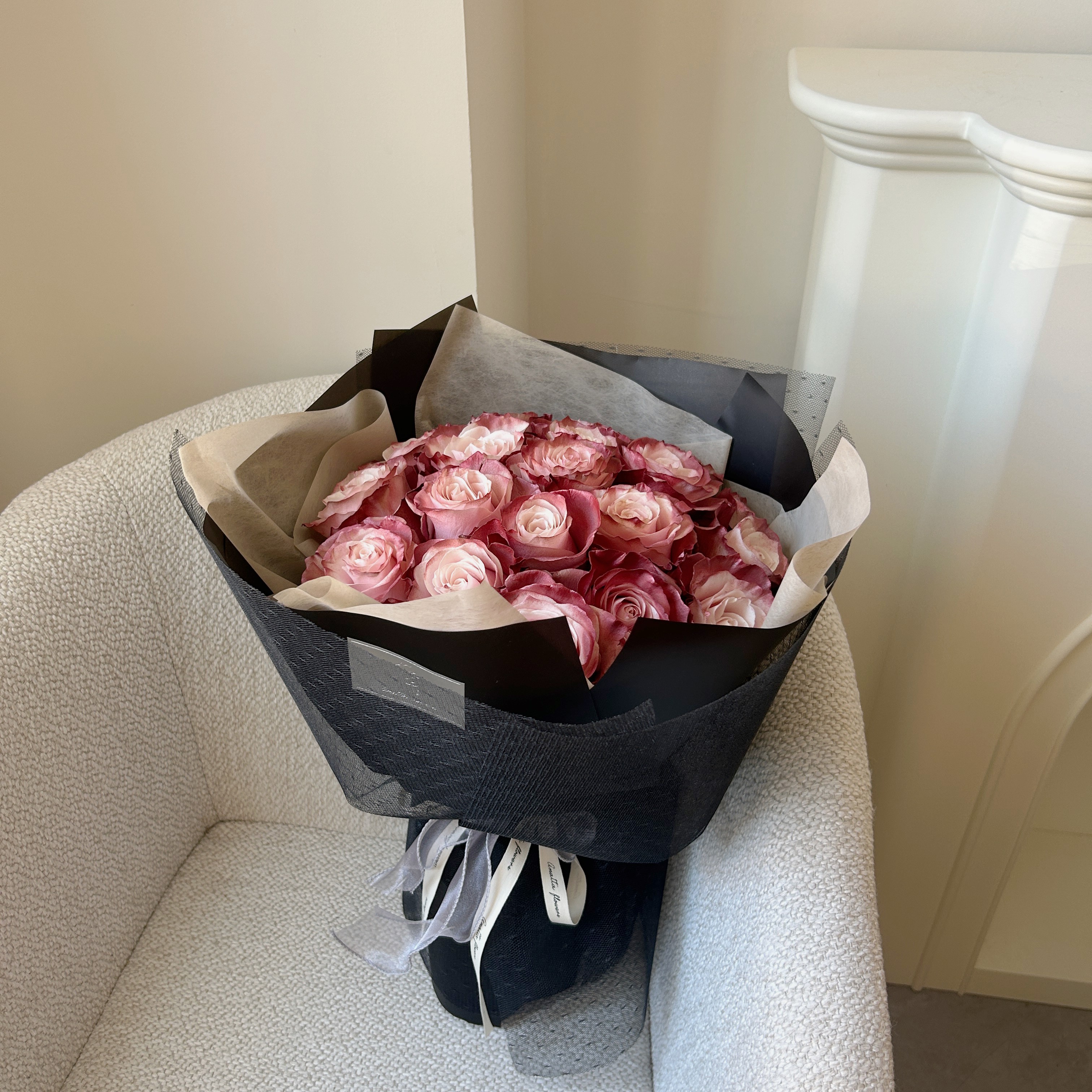 This bouquet includes 19 premium tinted roese and wrapped in a round shaped bouquet