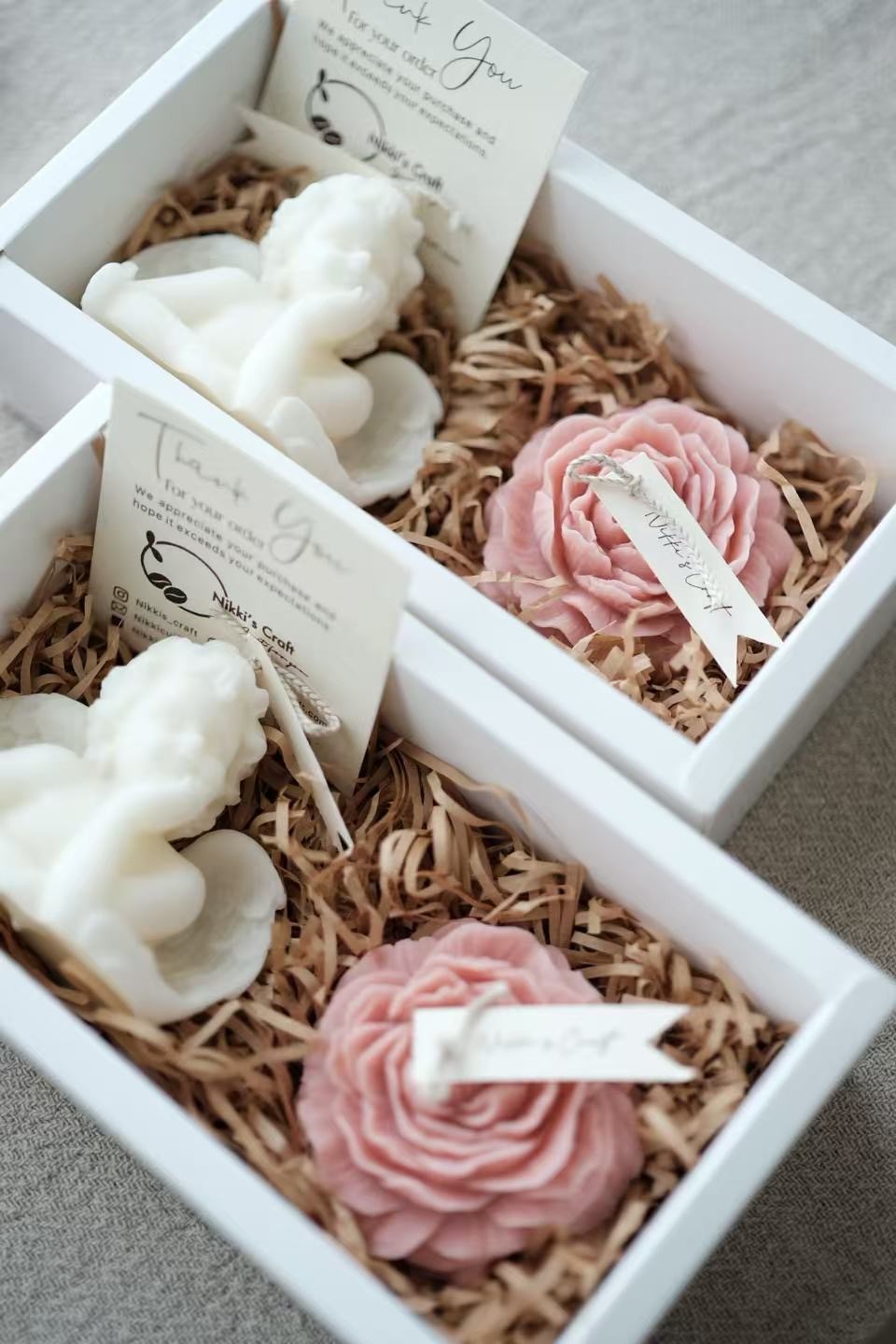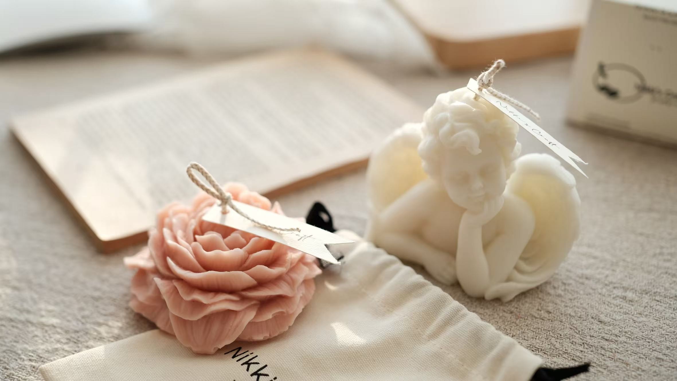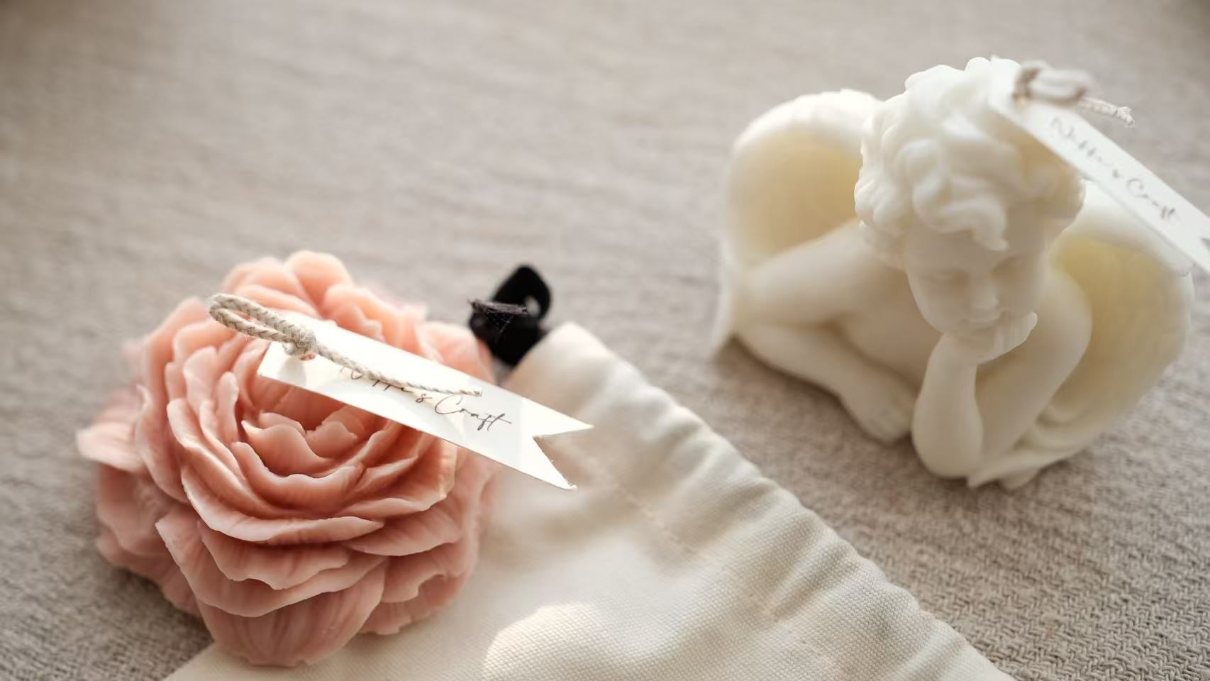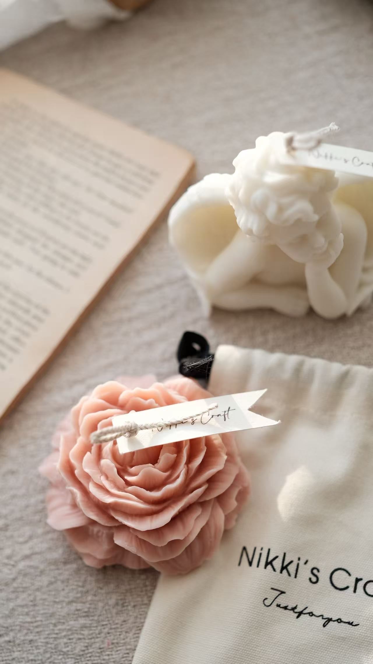 由迪拜受训工坊手工浇注:一支花瓣分明的芍药造型蜡烛,一尊雕塑感天使蜡烛。两者以天然大豆蜡制成,表面细腻,香味低调,不张扬。