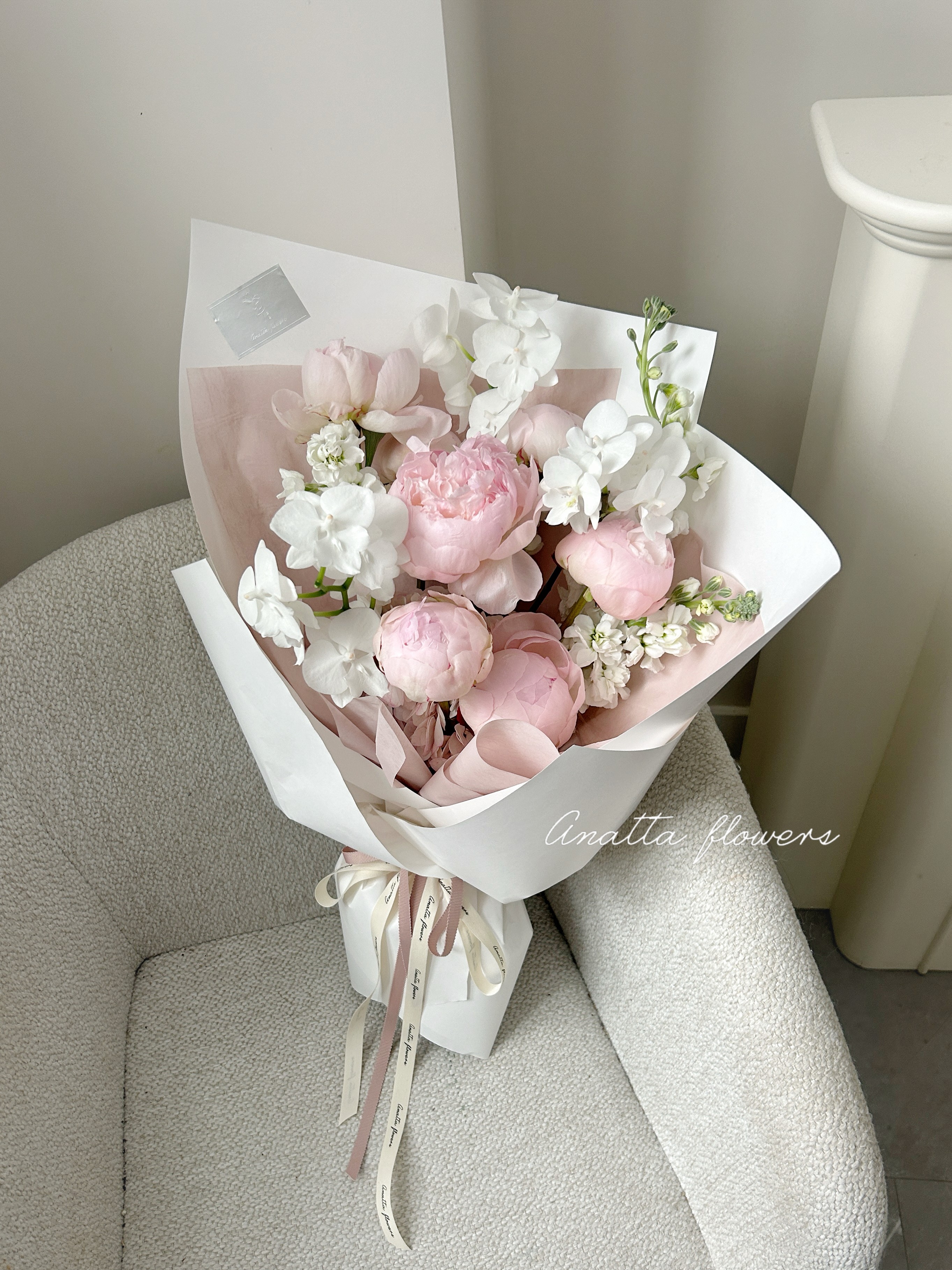 This peony and phalaenopsis bouquet is composed of soft peony blooms paired with elegant white phalaenopsis.