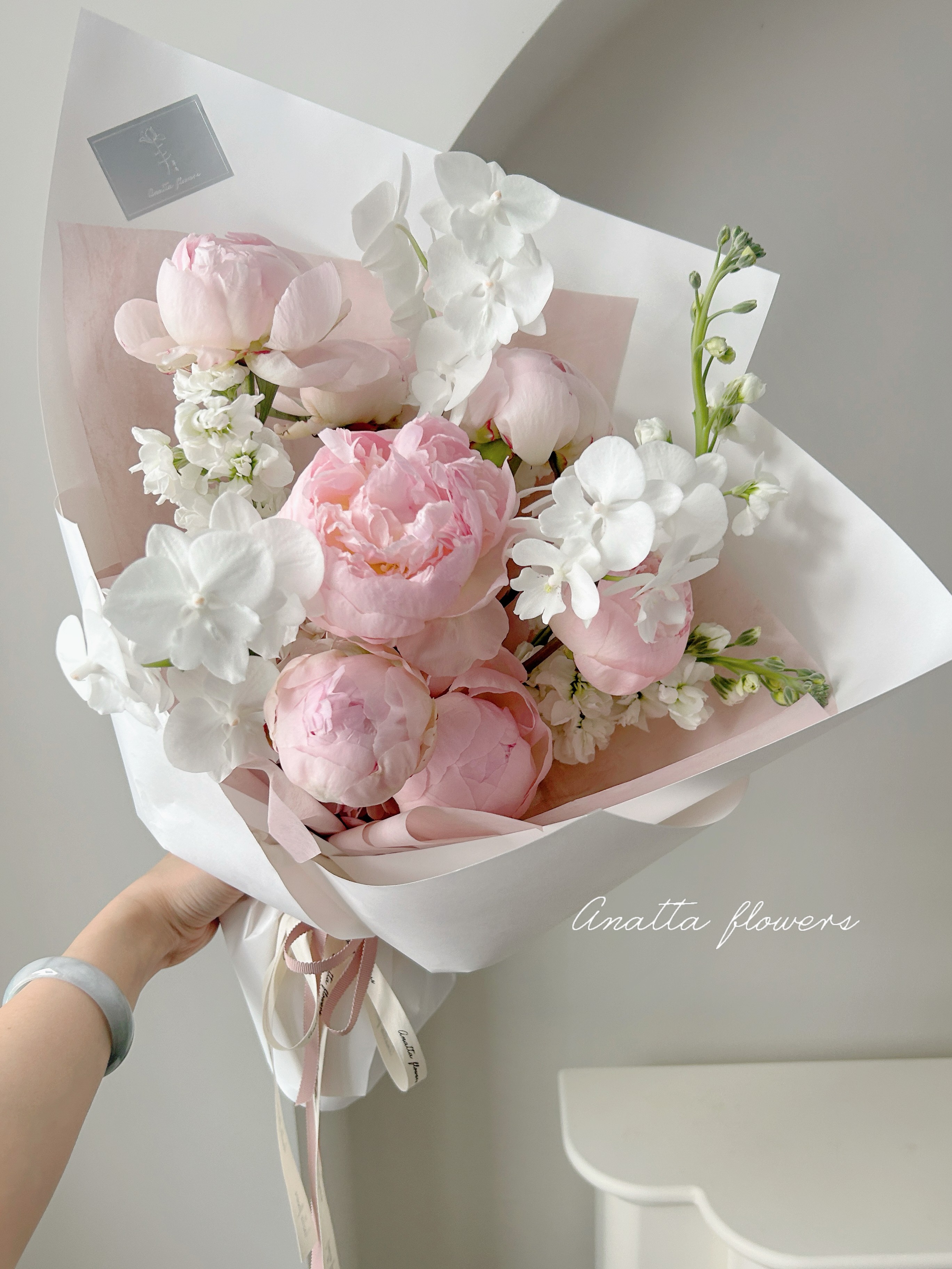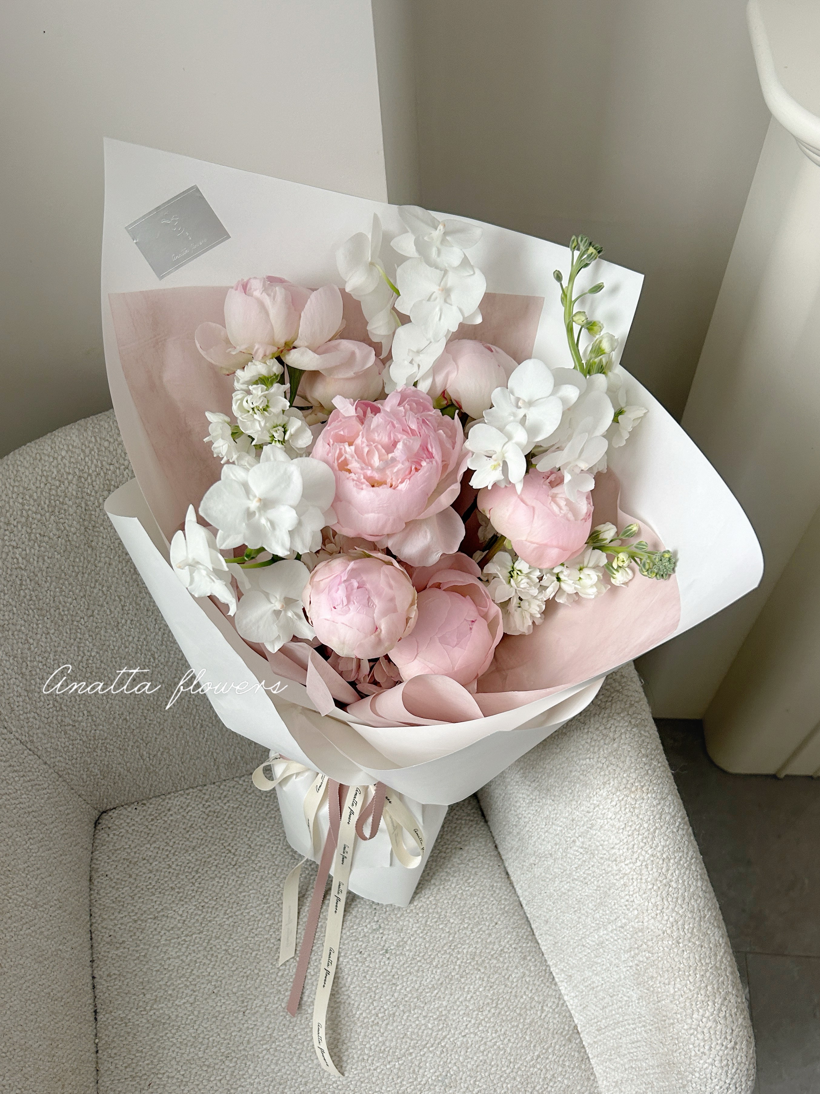 The arrangement emphasizes lightness and natural flow. Full peonies create a gentle focal presence, while phalaenopsis adds structure and quiet contrast, resulting in a balanced and airy composition.
