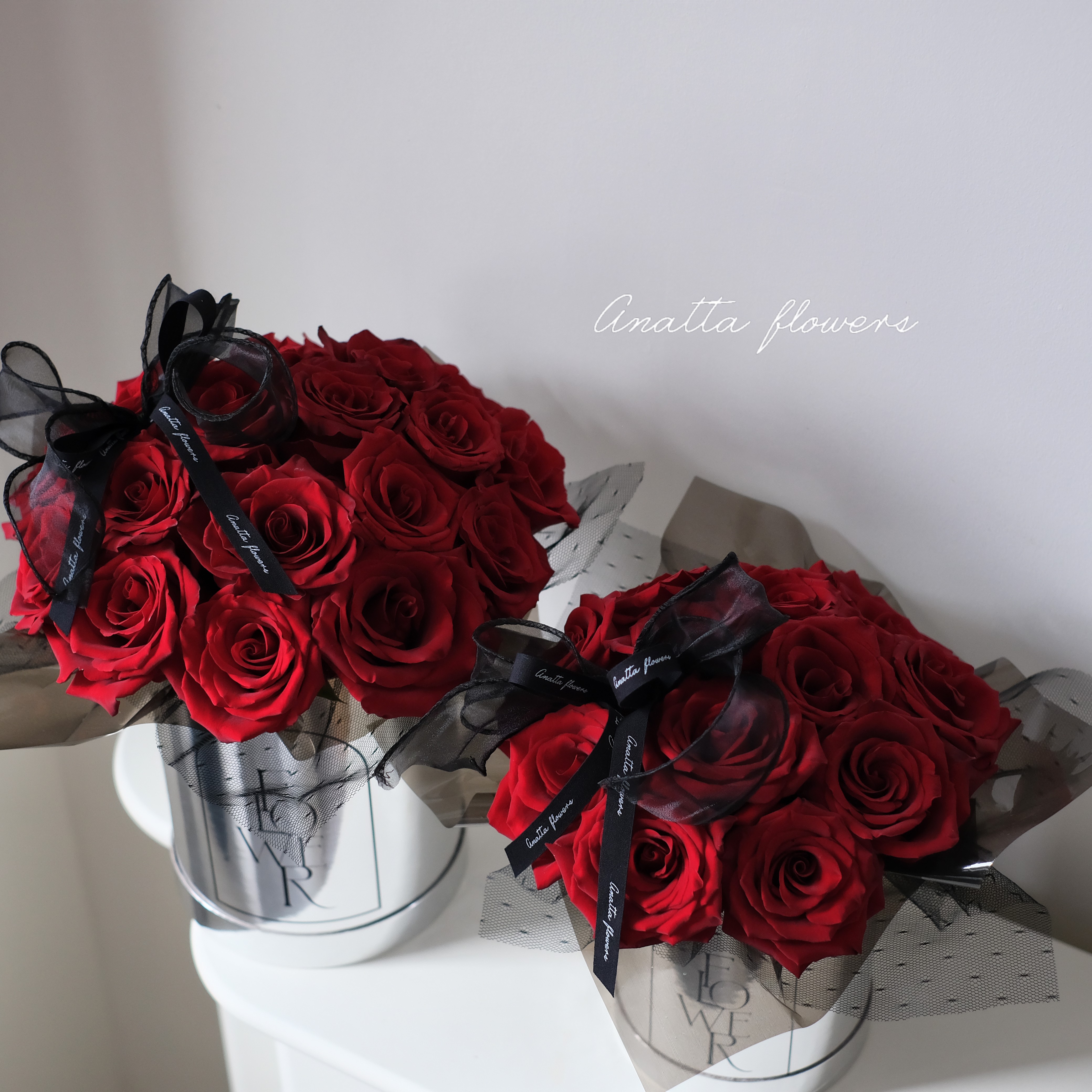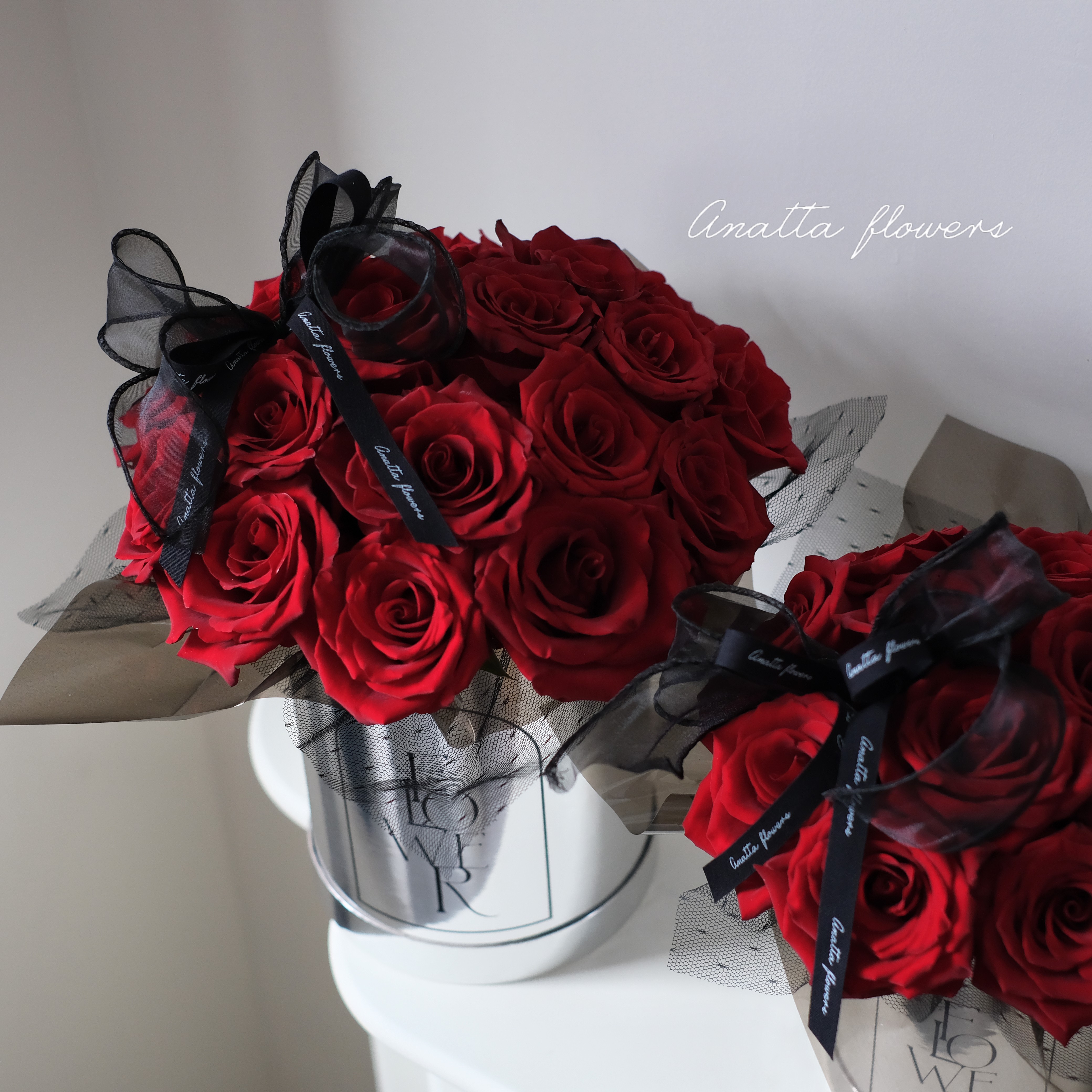 A modern red rose box designed for gifting, available in two sizes.