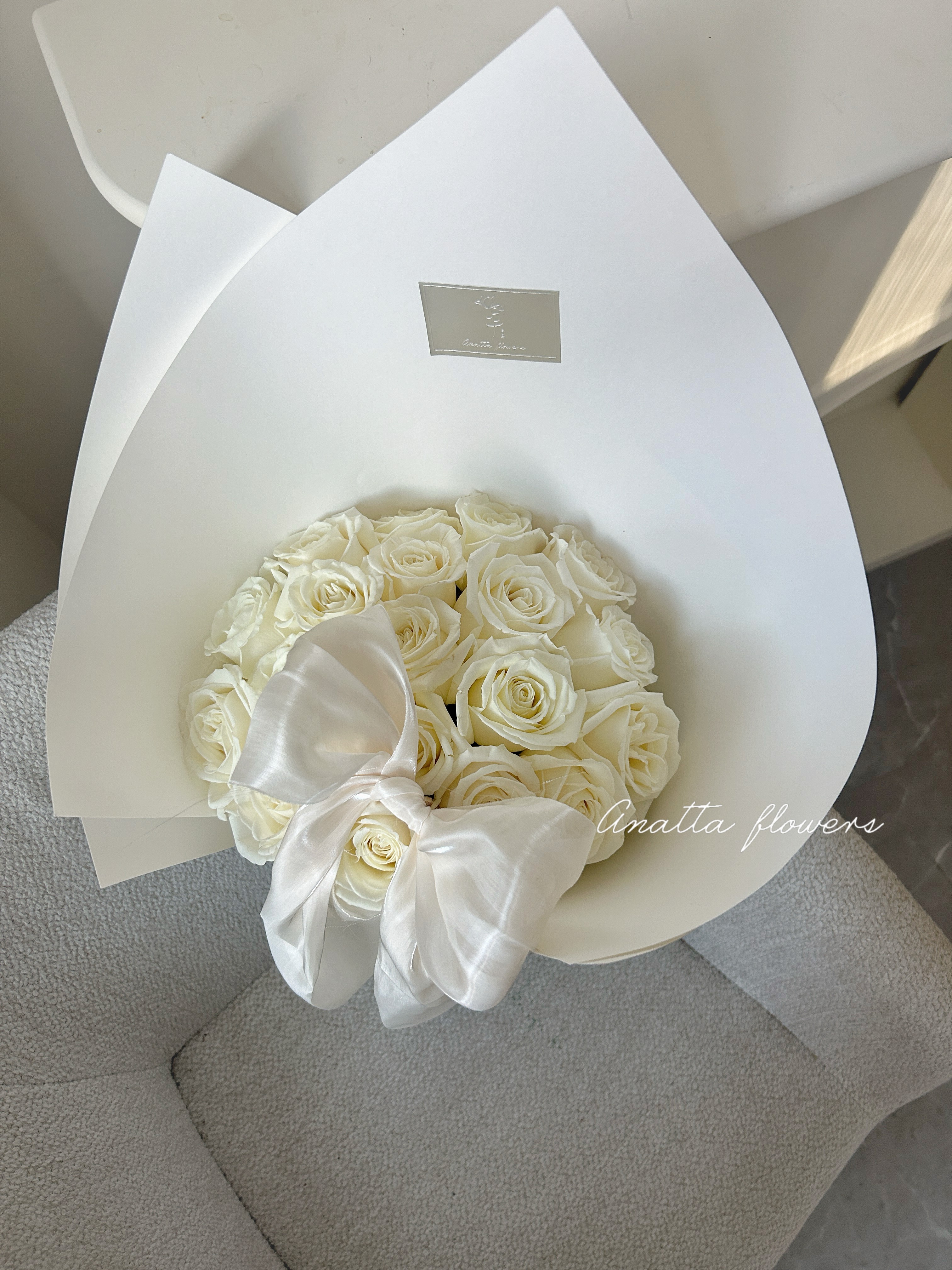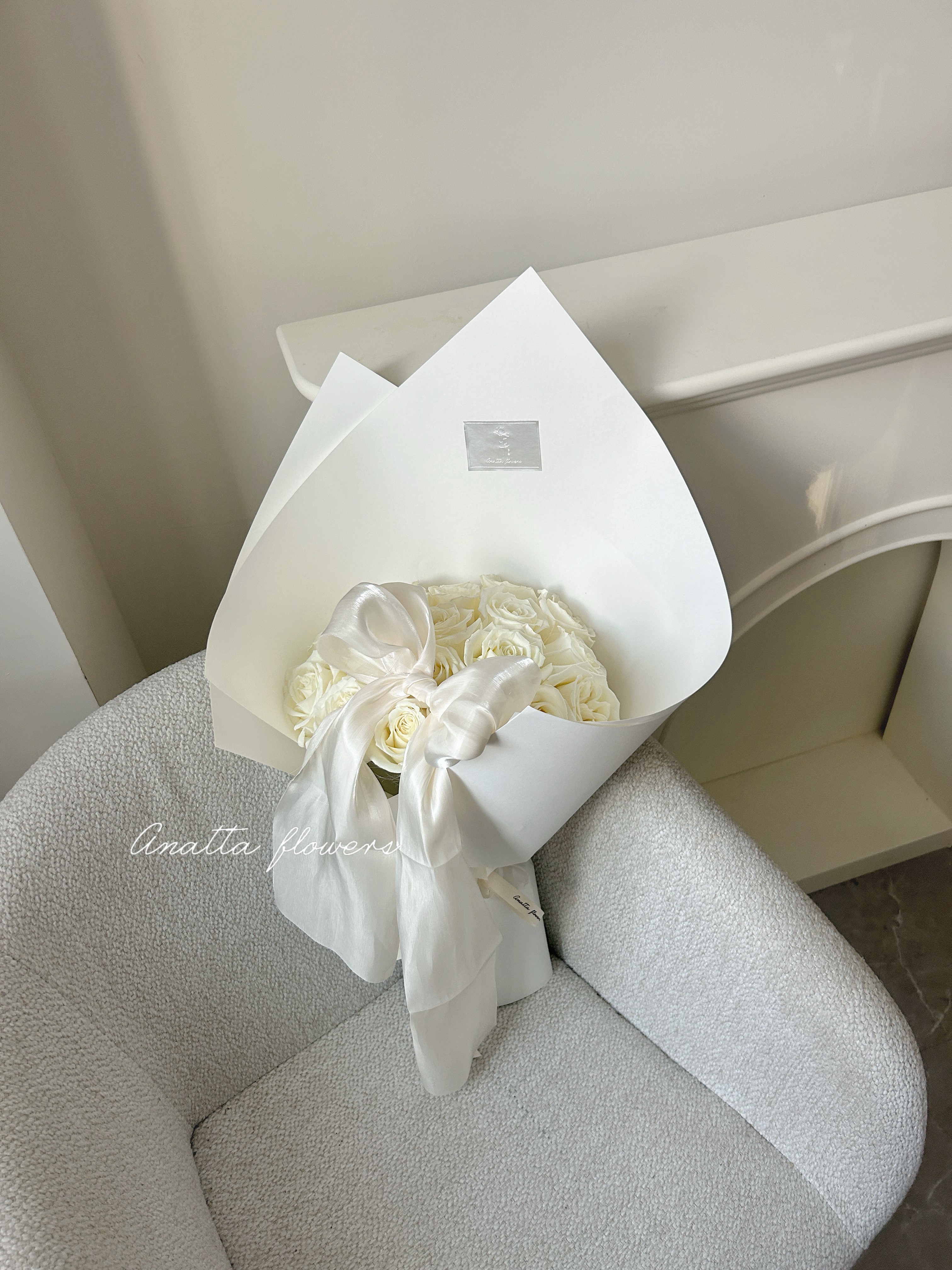 The roses are selected for consistent tone and full bloom, creating a calm and balanced overall look. Finished with minimal white wrapping and a light ribbon bow for a soft, refined presentation.