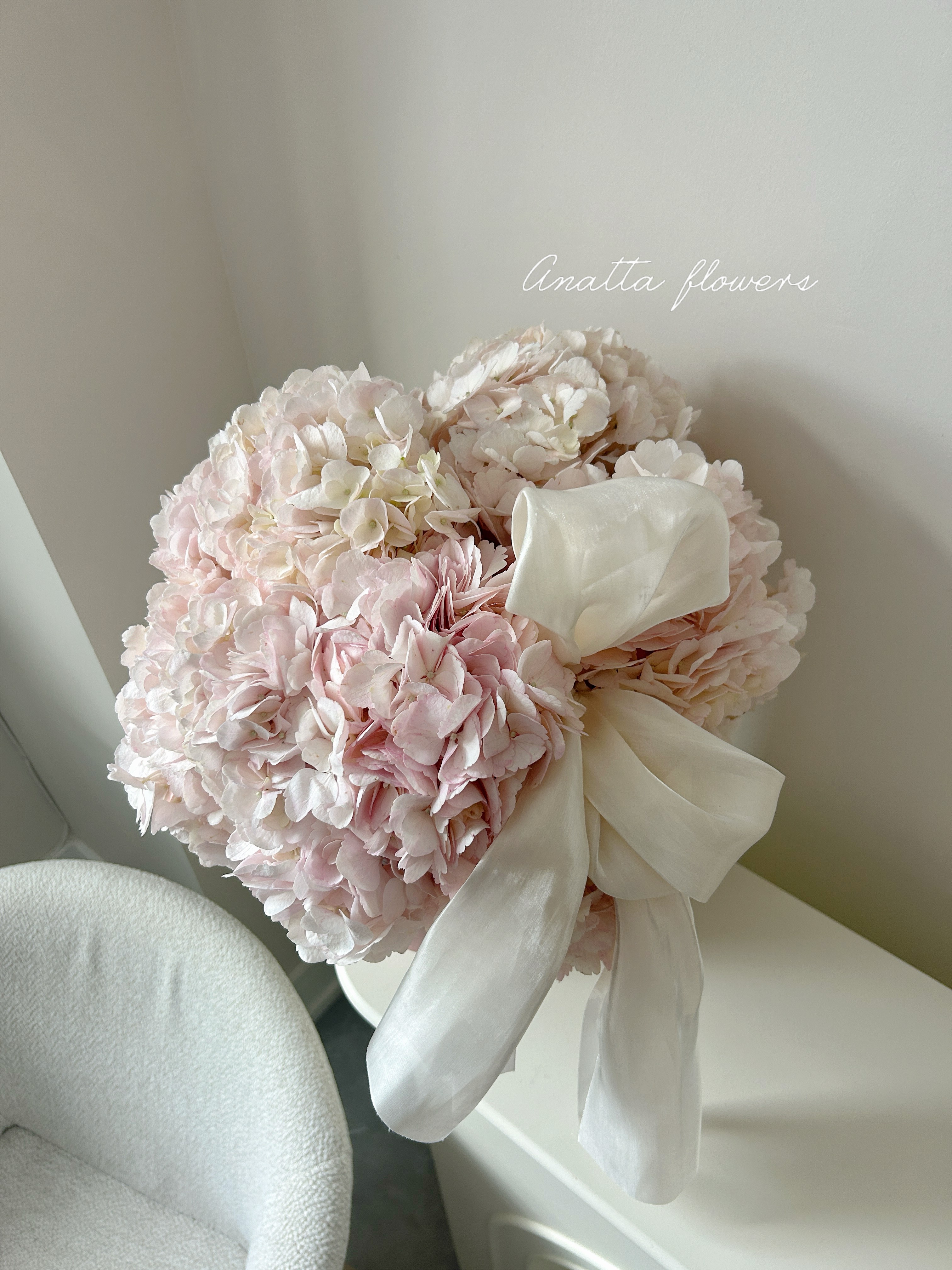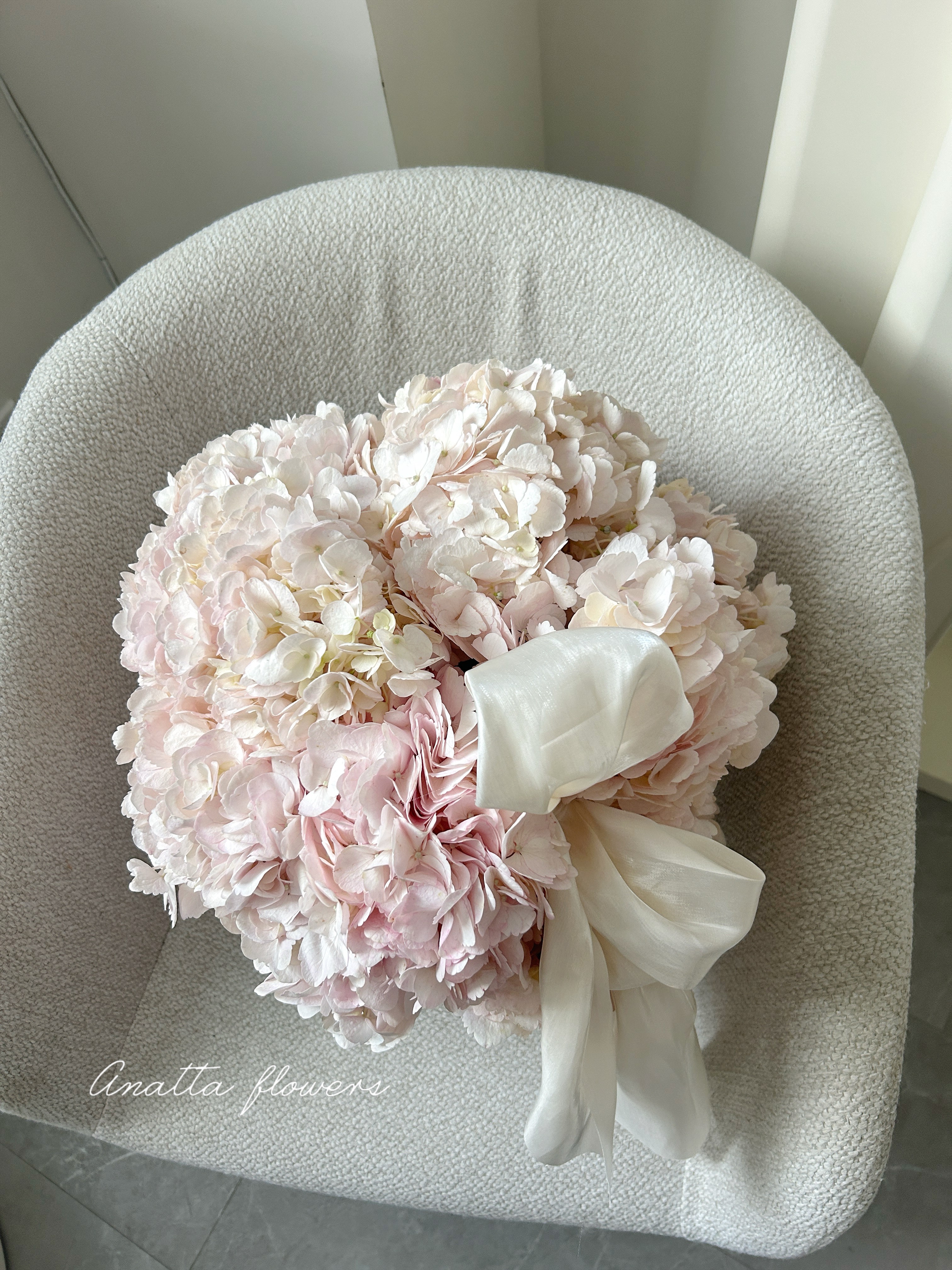 The design focuses on fullness and a rounded silhouette. Layered hydrangea petals create a cloud-like texture, while the monochrome palette keeps the look calm and refined.