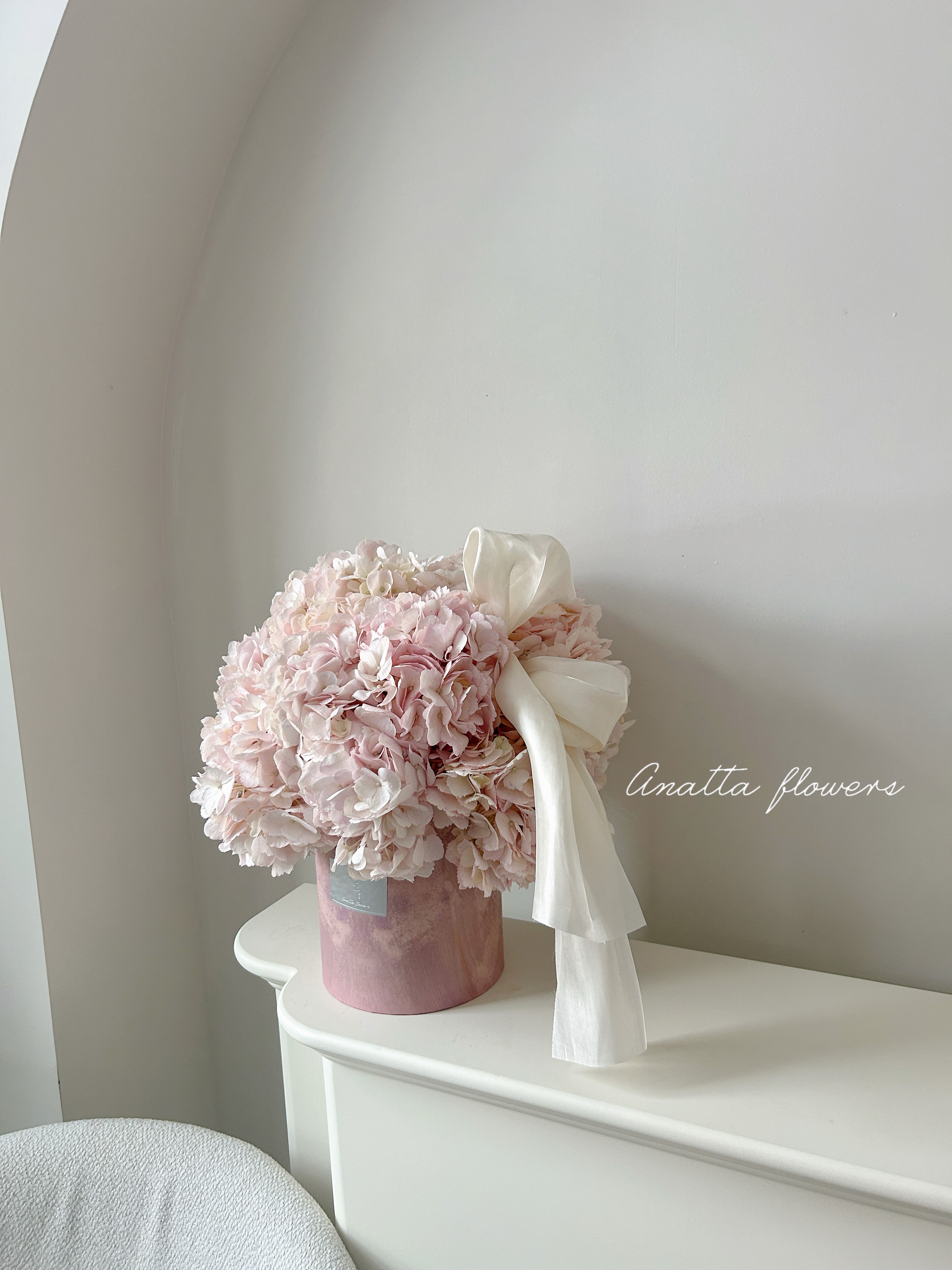 A blush hydrangea hat box arrangement finished with a soft ribbon bow, designed for a full and gentle floral statement.